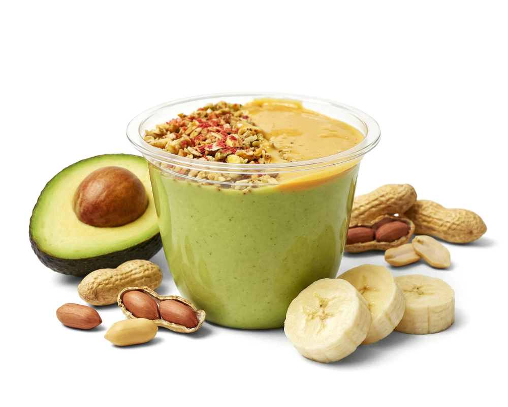Green Power Bowl je pro všechny, kdo chtějí víc než jen sladkou chuť. Kombinace banánu, avokáda a špenátu ti dodá stabilní energii, žádný sugar crash. Plus ovesné vločky, arašídové máslo a křupavé musli – takže jo, fakt zasytí.
